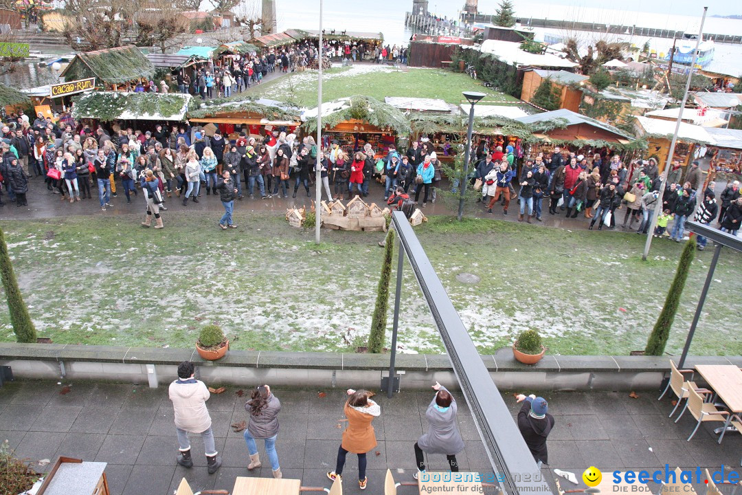 Trotz Nieselregen schlendern am Samstagnachmittag hunderte Besucher über den Weihnachtsmarkt in Konstanz. Zwischen Marktstätte und Konzil herrscht vorweihnachtliche Stimmung, überall an den Marktständen leuchten Lichter, Glühweinduft und Harfenklänge liegen in der Luft.