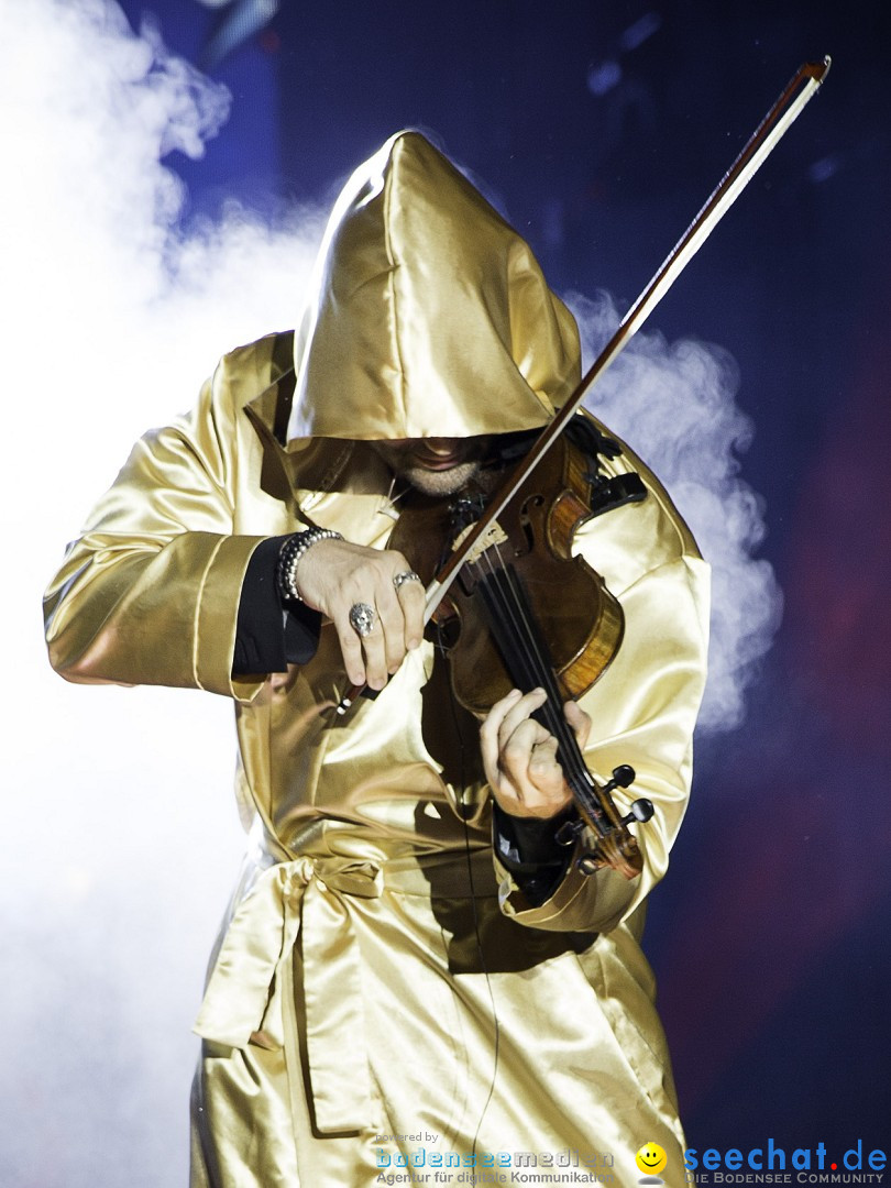 Der zweite Teil des Konzertes wurde pompös mit einem beeindruckenden Fackelzug eröffnet. David Garrett in einem goldenen Boxermantel, die Kapuze tief in die Stirn gezogen, löste wahre Begeisterungsstürme im Publikum aus.