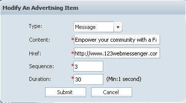 If you want to modify an advertisement, select that item in the form below the Delete button and click the Modify button. Then the following panel will popup, click the Submit button after you finish modifying the relevant information. At last, don't forget to click the Submit button in the Advertising Setting Panel.